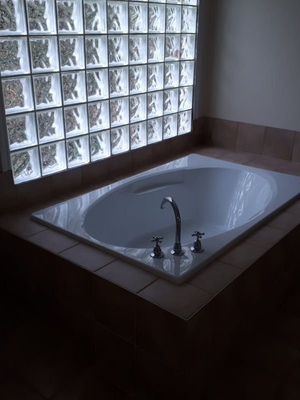 The original bathroom featured a large built-in tub and glass block window but felt dark and visually heavy due to dated finishes and limited lighting. The updated space keeps the tub in place while introducing lighter surfaces, polished flooring, and improved lighting, making the room feel more open and easier to maintain. A streamlined vanity and cleaner wall finishes help reduce visual clutter and improve storage efficiency.