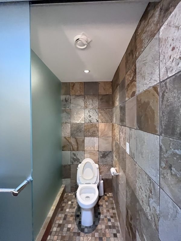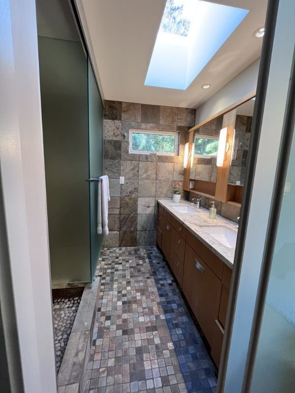 This rustic bathroom renovation focused on creating a natural, spa-like environment using river rock flooring, full-height stone tile walls, and custom wood cabinetry. The project included a walk-in shower with textured stone surfaces, updated lighting, and a skylight to bring in natural light, enhancing the warmth and depth of the materials. The result is a bathroom that feels grounded, durable, and intentionally designed around texture rather than trend.